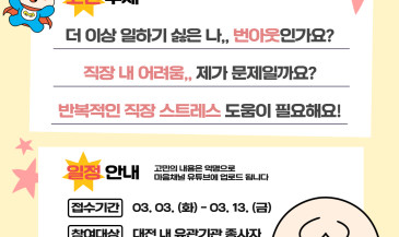 "고민 딱! 대.시.고 당신의 고민, 전문가가 답합니다"대전시민고민자랑에 참여하시면, 고민 중 일부를 선정하여 정신건강의학과 전문의가 영상으로 답변드립니다.대전시민고민자랑은 총 5회 진행 예정이며, 고민은 익명으로 대전정신건강복지센터 마음채널 유튜브에 업로드됩니다. (1회차는 4월 30일 업로드 예정)★ 참여대상: 대전 내 정신건강 및 지역사회기관 종사자★ 고민 주제ㆍ번아웃 및 직장생활 어려움★ 고민 접수 기간ㆍ03.03. (화) - 03.13. (금) 까지★ 응모방법1. QR or