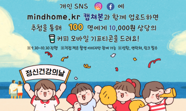 정신건강의날 1010 손글씨 이벤트!!!추첨을 통해 100명에게 커피 쿠폰을 드립니다~!1. 손글씨로 "10월10일 정신건강의날""마음똑똑 정신건강의 집" 을 적고 마음의 집을 그리기!2. 대전정신건강 온라인박람회 홈페이지 mindhome.kr을 캡쳐하기!3. #대전정신건강온라인박람회 #10월10일정신건강의날 #마음똑똑정신건강의집 해시태그 쓰기!4. https://forms.gle/VyXFwgNBdNsrAdDF8구글 설문지 링크에 성함, 연락처