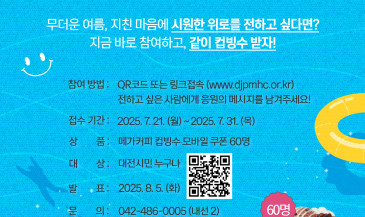 ♡ 무더운 여름, 지친 마음에 전하는 시원한 응원'마음 빙수, 너의 여름을 응원해!'지치고 힘든 여름날, 누군가에게 전하고 싶은 응원의 메시지가 있나요?당신의 따뜻한 마음과 함께 시원한 컵빙수를 선물해보세요! ★ 이벤트 접수 기간ㆍ2025년 7월 21일(월) ~ 7월 31일(목)★ 참여 대상ㆍ대전시민 누구나★ 응모방법ㆍQR or 구글폼 링크 접속★ 이벤트 선물ㆍ총 30건의 메시지 선정ㆍ선정된 메시지를 보낸 사람과 받은 사람 모두에게 컵빙수 모바일 쿠폰 증정ㆍ총 60명 대상♥ 응원의