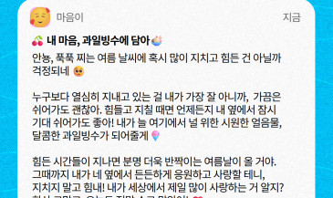 마음빙수, 너의 여름을 응원해! 응원 메시지 공개!여러분이 보내주신 시원하고 따뜻한 응원을 함께 나눕니다! 무더운 여름, 서로의 한마디가 큰 힘과 위로가 되길 바라요 ♥