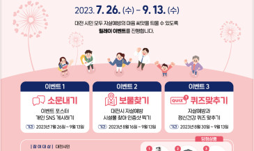 「대전광역정신건강복지센터(부설: 대전광역자살예방센터, 대전청년마인드링크」는 9월 10일 세계 자살예방의 날과 개소 10주년을 기념하여대전시민에게 자살 예방의 중요성과 올바른 정보 전달을 통해 지속적인 관심을 유도하고, 긍정적인 사회적 인식변화를 도모하고자 마음틔움 이벤트를 진행합니다. ♡많은 관심과 참여 부탁드립니다♡ ▶이벤트 안내- 참여기간 : 2023.7.23. (수) ~ 9.13. (수)- 참여방법 : 대전광역정신건강복