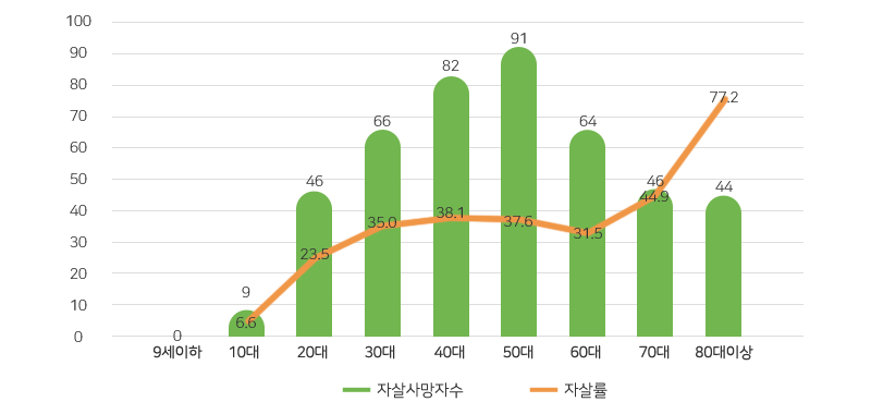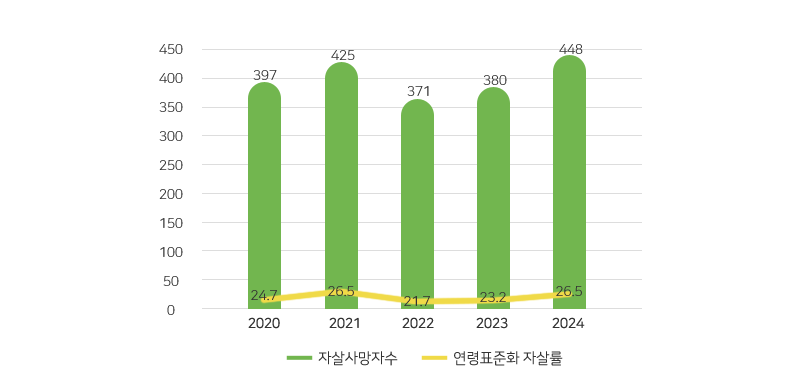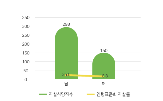 - 연령표준화 자살률 인구구조가 다른 집단간의 사망 수준을 비교하기 위해 연령구조가 자살률에 미치는 영향을 제거한 자살률